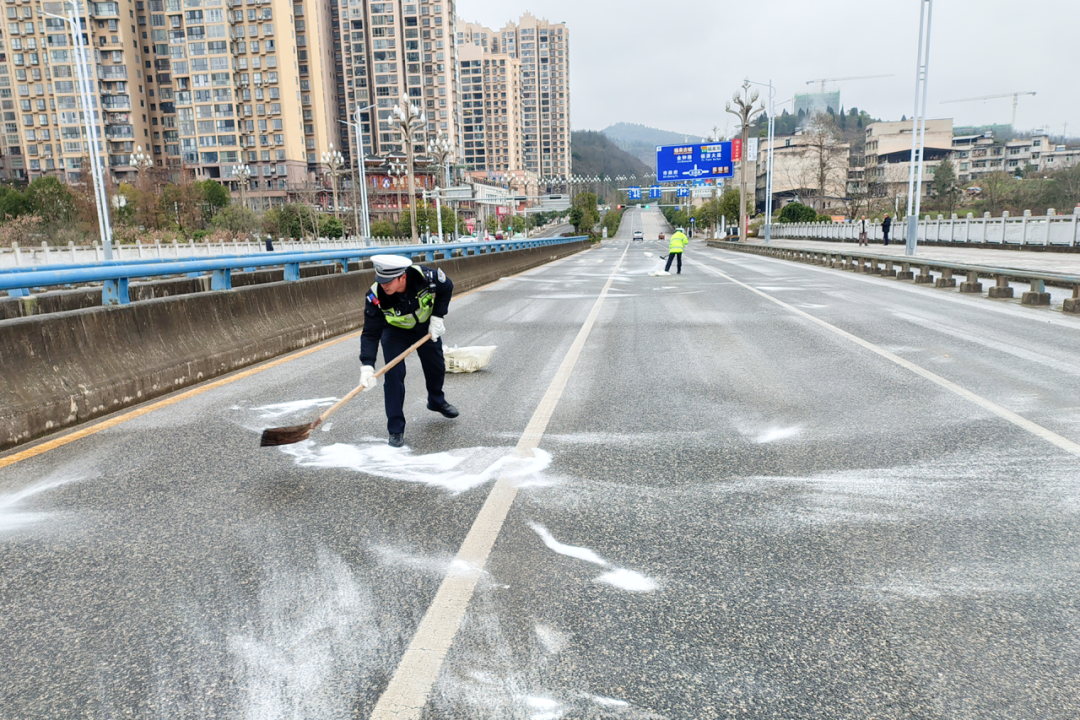 在叠翠大桥,巡逻交警发现桥面出现凝冻后,立即启动应急处置流程。他们第一时间疏导现场交通,引导车辆减速避让,随后顶着刺骨寒风开展融雪剂作业。经过近20分钟的紧张奋战,桥面结冰安全隐患消除,道路恢复安全通行。