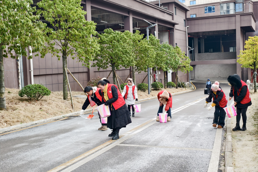当天,福泉市各乡镇(街道)村(社区)也组织干部群众、志愿者开展撒盐除冰工作。