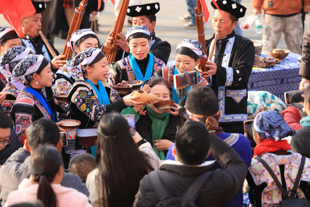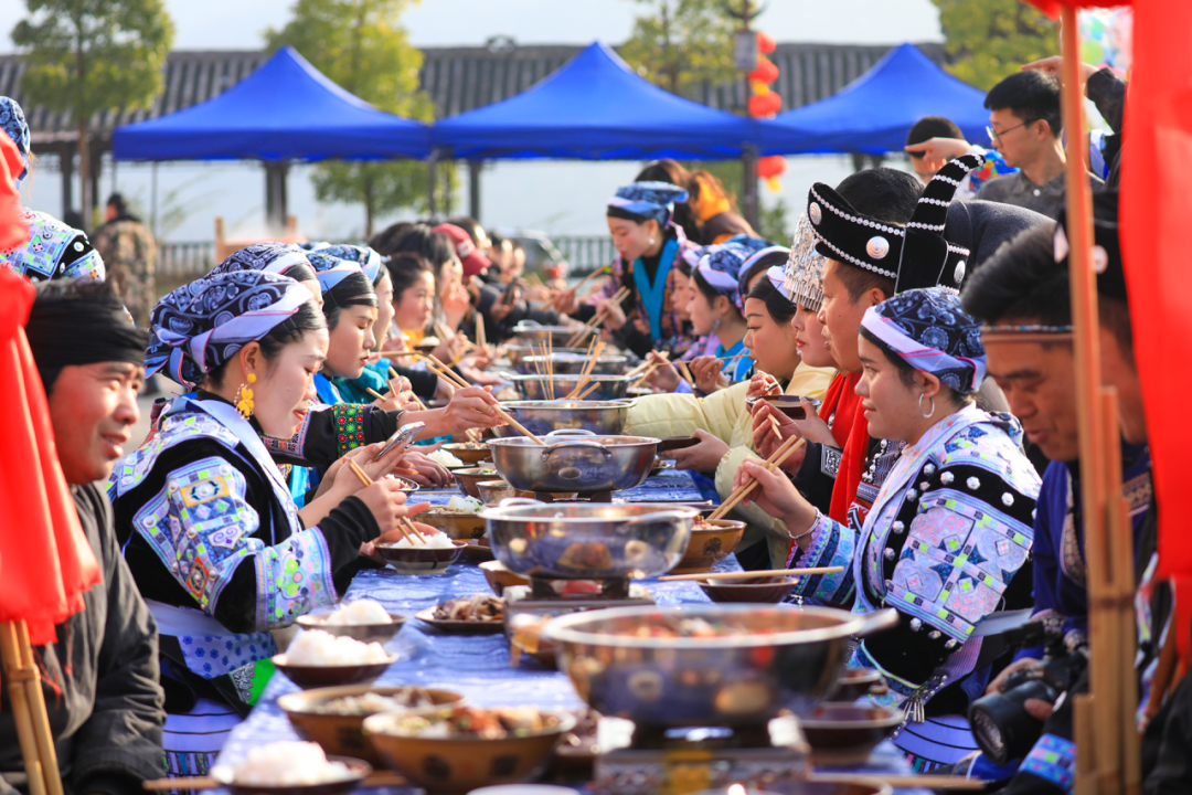 作为本次活动的核心环节,刨汤宴让游客品味到最地道的苗乡年味。热气腾腾的“年猪菜”鲜香醇厚,搭配腊肉、手工豆腐等苗家特色菜肴,长桌宴上宾主尽欢,碗筷交错间,陌生的距离悄然消融,这不仅是味蕾的盛宴,更成为各族群众情谊交融的纽带。
