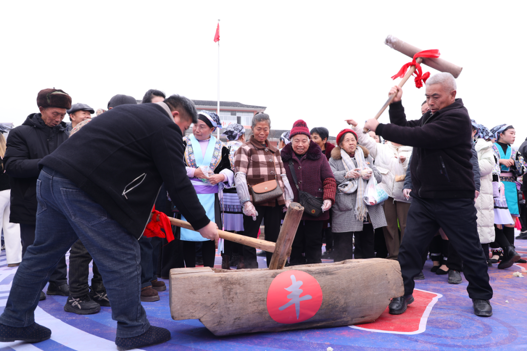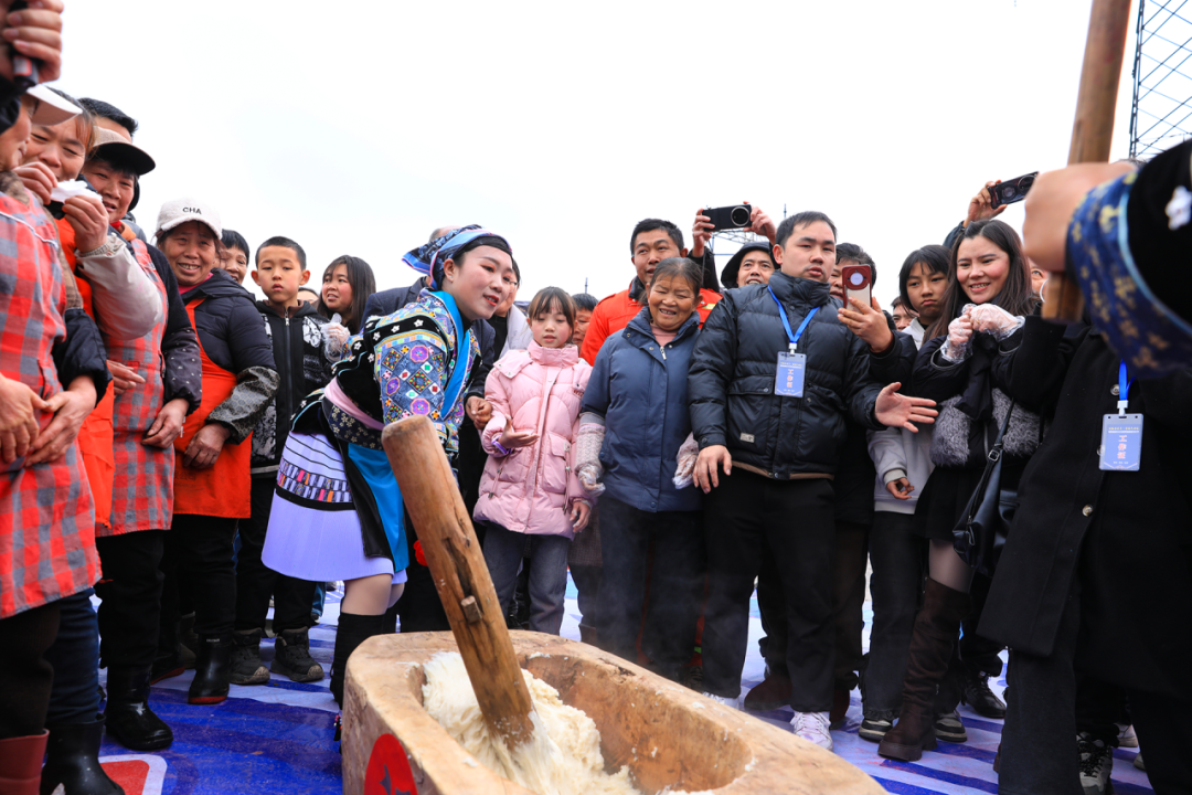 在百人打糍粑活动中,6口木臼有序排开,热气腾腾的糯米被倒入臼中,几位经验老到的村民率先上场,双臂抡起沉重的木槌,一记记扎实地捶打,木槌起落间,糯米渐渐变得绵密黏糯。越来越多的游客按捺不住,也纷纷挽起衣袖、上前“接力”,现场欢呼喝彩交织在一起,热闹非凡。